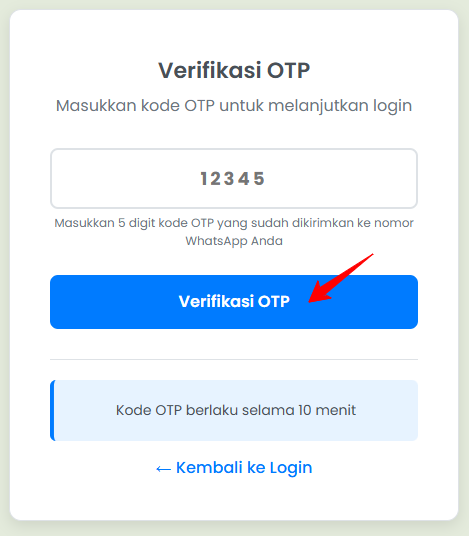 Masukkkan kode OTP verifikasi yang akan dikirimkan otomatis ke nomor WhatsApp Anda, dan klik tombol: Verifikasi OTP.
