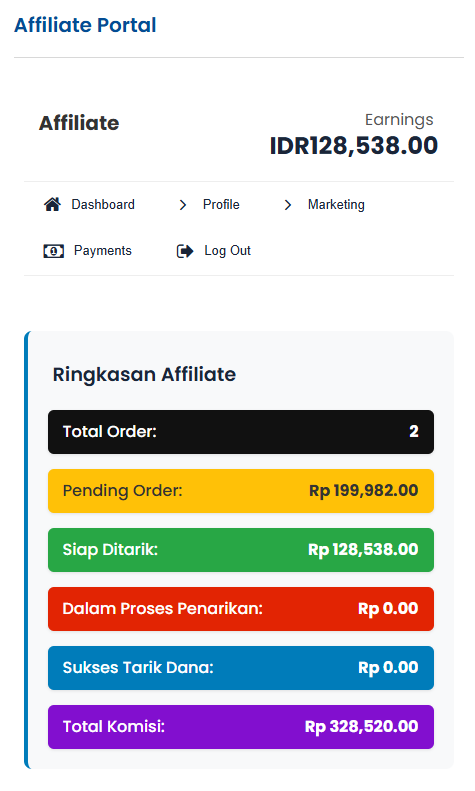 Klik “Payments” untuk melihat jumlah dan detail penarikan dana affiliate Anda.