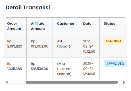 Scroll di bagian bawah halaman, maka dapat terlihat tabel transaksi terakhir yang dilakukan melalui link affiliate Anda.