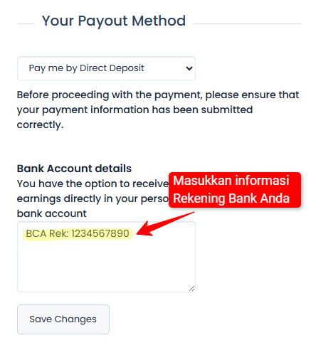 Masukkan informasi Rekening Bank Anda melalui menu: Profile -> Payout Detail.