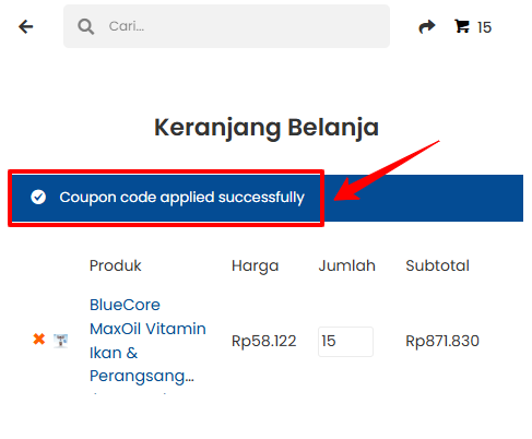 Klik link voucher yang diberikan oleh mitra manager, maka pada saat checkout akan ada notifikasi penggunaan kode voucher berhasil.