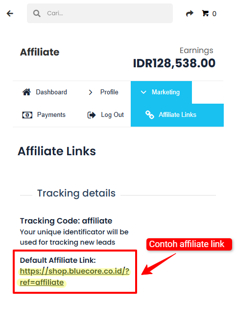 Yang berbeda hanya untuk link yang digunakan harus melalui url resmi affiliate Anda. Misal: https://shop.bluecore.co.id/?ref=UserAffiliateAnda.
