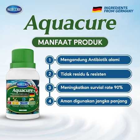 BlueCore Aquacure Antibiotik alami tanpa meninggalkan residu dan tidak menyebabkan resistensi antibiotik. Mengobati berbagai macam penyakit ikan, seperti: Vibrio Harveyi, Insang merah, Moncong putih, Jamur, Bakteri, Sisik Mengelupas, ekor busuk, Aeromonas, dan Pseudomonas.