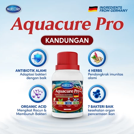 AquaCurePro tidak meninggalkan residu dan tidak menyebabkan resistensi antibiotik. Untuk mengobati berbagai macam penyakit ikan, seperti: Vibrio Harveyi, Insang merah, Moncong putih, Jamur, Bakteri, Sisik Mengelupas, ekor busuk, Aeromonas, dan Pseudomonas.