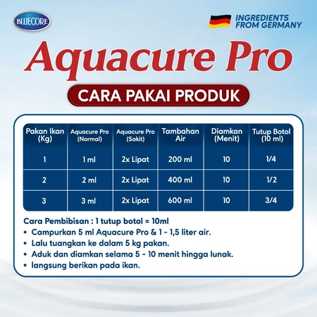 Aquacure Pro aman digunakan setiap saat karena terbuat dari bahan – bahan pilihan import jerman, produk ini mengandung double action formula yang terdiri dari 4 herbal pilihan, 7 bakteri baik & organic acid yang lebih efektif dalam mengobati berbagai penyakit ikan.