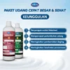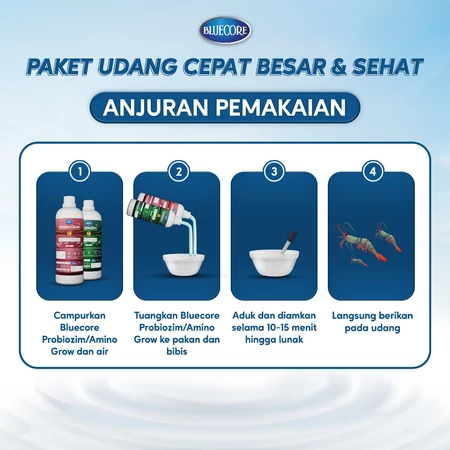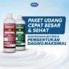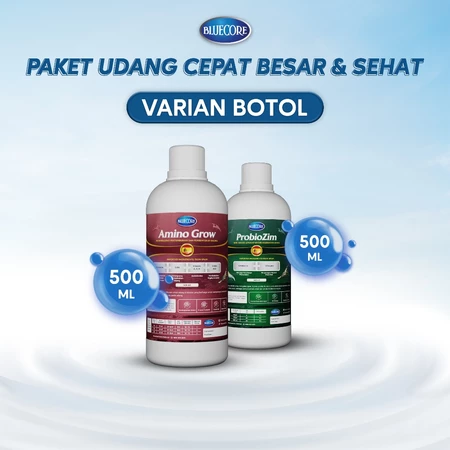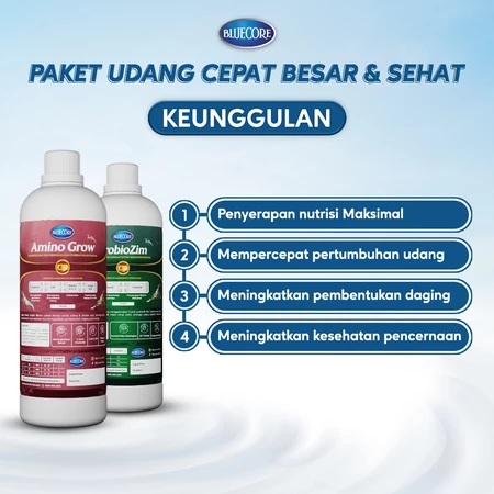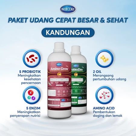 Paket terdiri dari Amino Grow untuk meningkatkan nafsu makan serta menambah bobot udang dan Probiozim untuk menjaga kualitas air dan meningkatkan penyerapan nutrisi udang