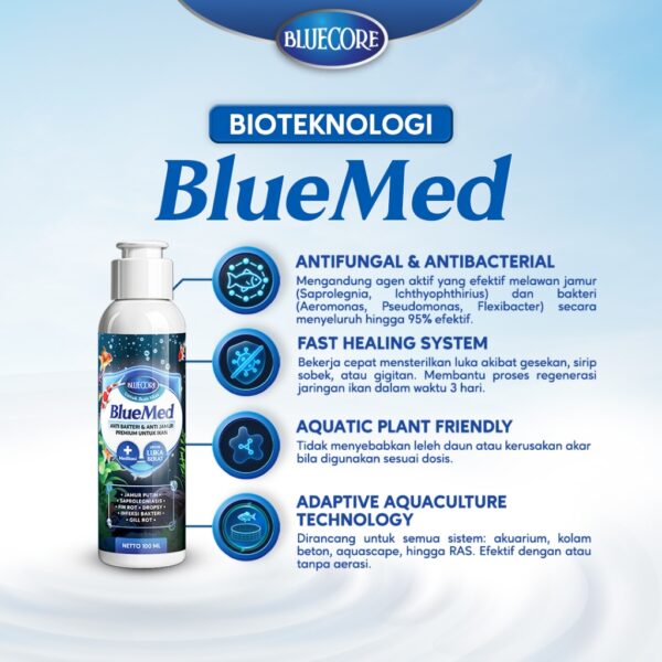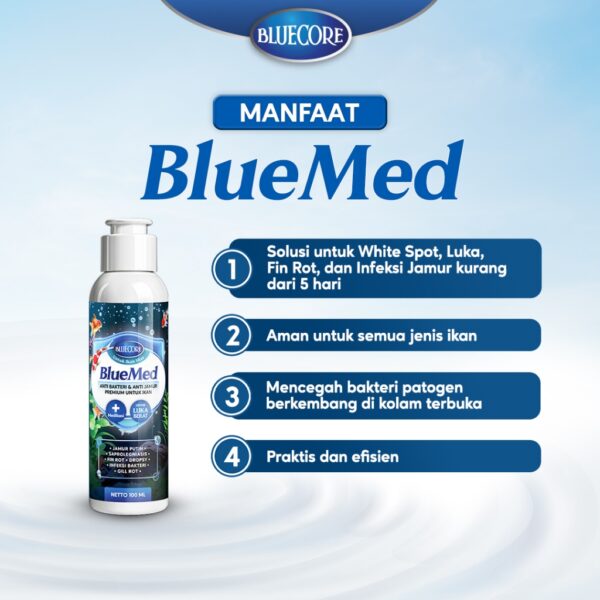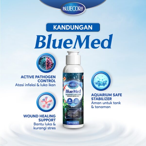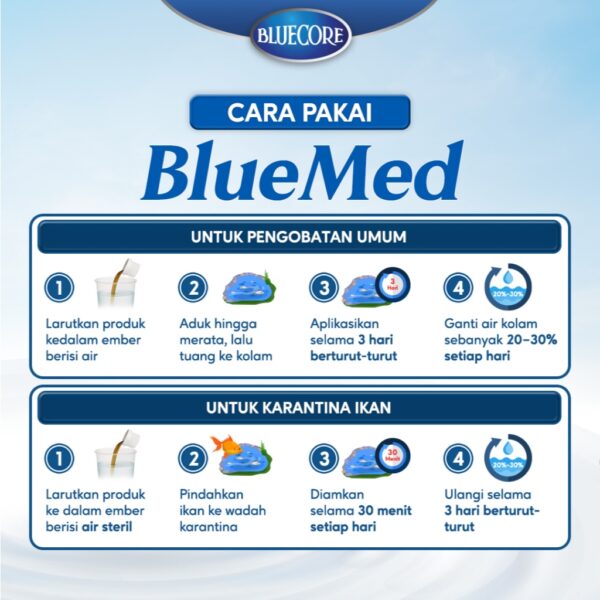 Blue Med adalah obat biru ikan antijamur dan antibakteri serbaguna untuk ikan hias air tawar maupun air laut. Dirancang khusus untuk mengatasi berbagai penyakit ikan seperti: