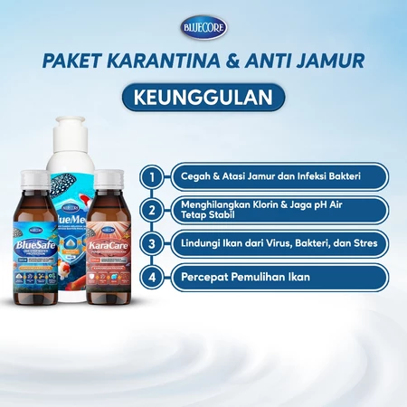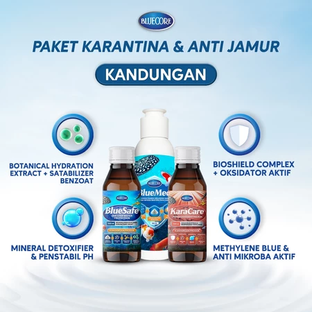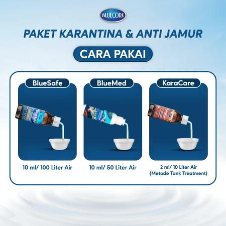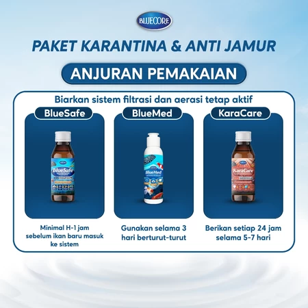 Menjaga kualitas air dan kesehatan ikan kini jadi lebih praktis dengan BlueSafe, KaraCare, dan BlueMed dari Bluecore. Paket ini memberikan perlindungan menyeluruh terhadap jamur, bakteri, dan virus yang sering menyerang ikan selama proses karantina dan pemindahan.
