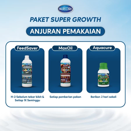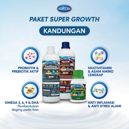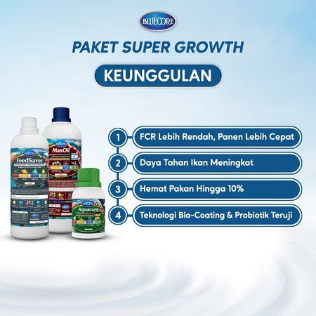Ingin meningkatkan efisiensi budidaya ikan sekaligus menghemat pakan? Bluecore menghadirkan Paket Super Growth yang dirancang khusus untuk meningkatkan performa pertumbuhan ikan secara maksimal. Dengan kombinasi Feedsaver, Maxoil, dan Aquacure, hasil panen jadi lebih cepat, efisien, dan tahan penyakit.