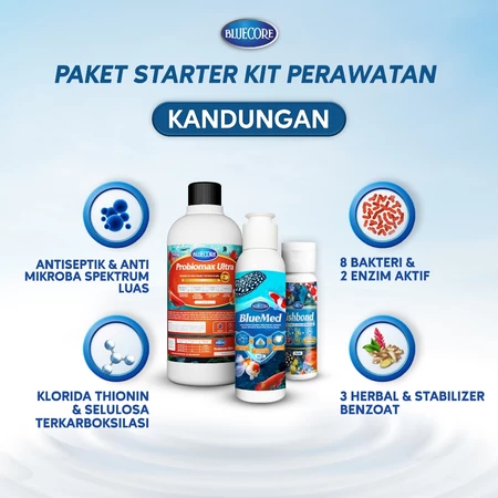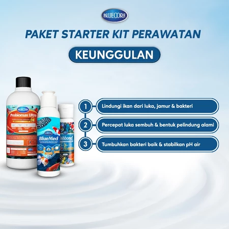 Ikan hias dan predator memiliki kebutuhan perawatan khusus, terutama dalam hal perlindungan terhadap luka, infeksi, dan kualitas air. Bluecore Starter Kit hadir sebagai solusi lengkap untuk menjaga kebersihan air, membantu menyembuhkan luka, dan menstabilkan ekosistem mikroba dalam akuarium atau kolam.